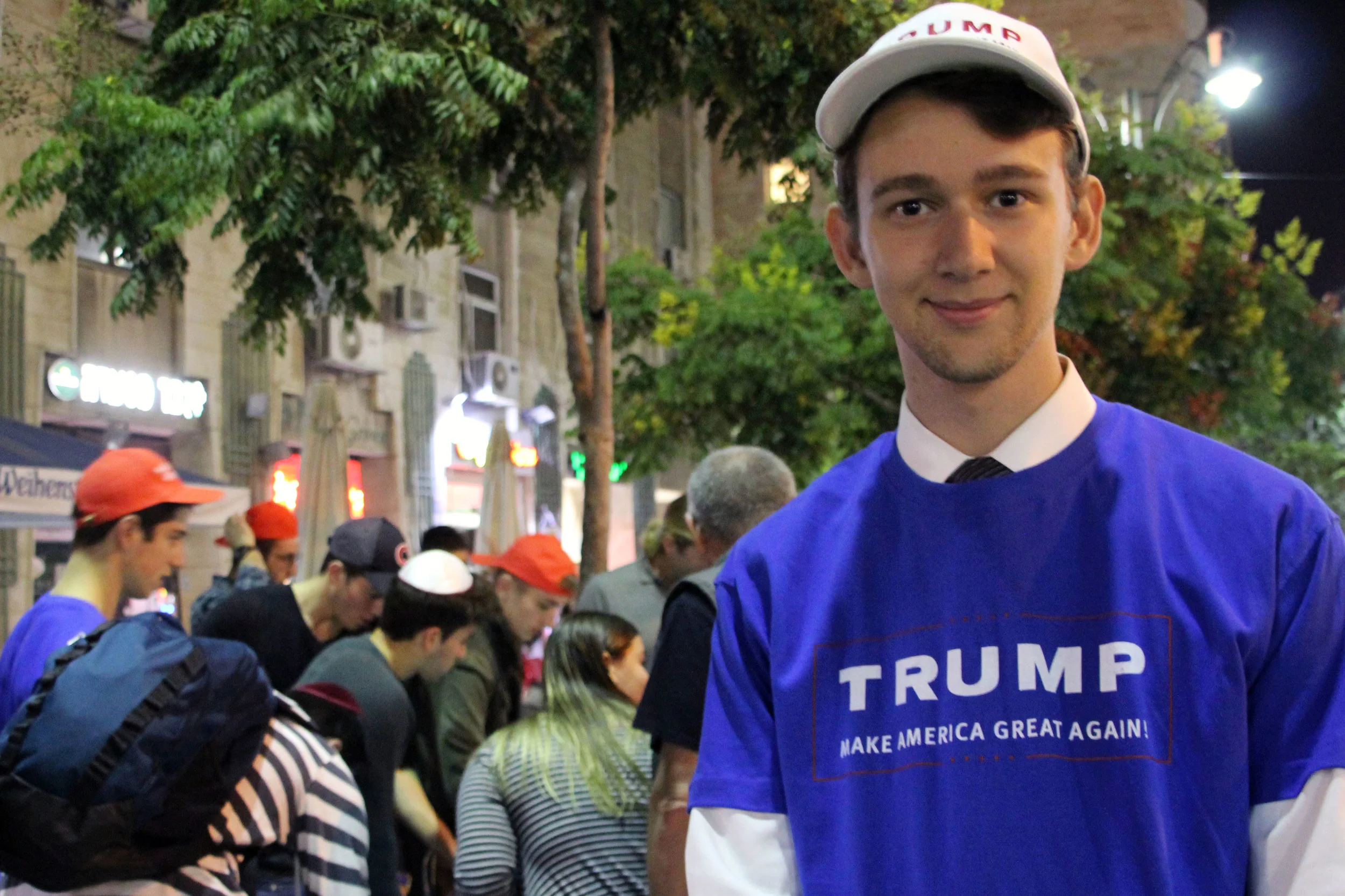 Han står bag et plastic-bord på gågaden, Jaffa Street, i den vestlige del af Jerusalem. Han er iført en blå trøje med ’Trump' skrevet hen over brystet. På bordet ligger kasketter, T-shirts og plakater med sloganet ’Make America Great Again’.